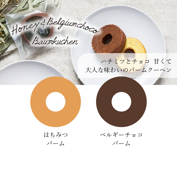 ハニーとチョコ、甘くて濃厚な味わいのバームクーヘンを詰め合わせました。袋を開けた瞬間甘い香りが漂い、贅沢なおやつタイムが楽しめます。シンプルなパッケージがおしゃれなスイーツギフトは、どなたに贈っても喜ばれる一品です。個包装のため、家族で分け合っても、ひとつずつゆっくり楽しんでも◎貰った方それぞれの楽しみ方でお召し上がりいただけます。はちみつ、アイシングなどデコアレンジで美味しくオシャレに楽しむのもおすすめです。