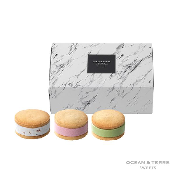 日本の自然の恵みをスイーツの世界へ、パティシエ独自の製法で作り上げられたスイーツコレクション「OCEAN&TERRE SWEETS」。香り豊かなラムレーズン、酸味が美味しいストロベリー、宇治抹茶の上品な味わいの3種のクリームを甘さ控えめサクサクなサブレでサンド。満足のいくボリューム感が嬉しい!白と基調としたエレガントで上品な印象を持たせてくれる箱に包まれた甘いもの好きにはたまらない一品です。