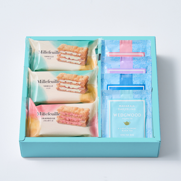 国産小麦100%のパイ生地に、バニラとフランボワーズの2種のクリームをサンドしたミルフィーユと、ウェッジウッドの紅茶4種をセットにしました。サクサクのパイと風味豊かなクリーム、そして紅茶の芳醇な香りが口の中に広がる、贅沢なティータイムをお楽しみください。