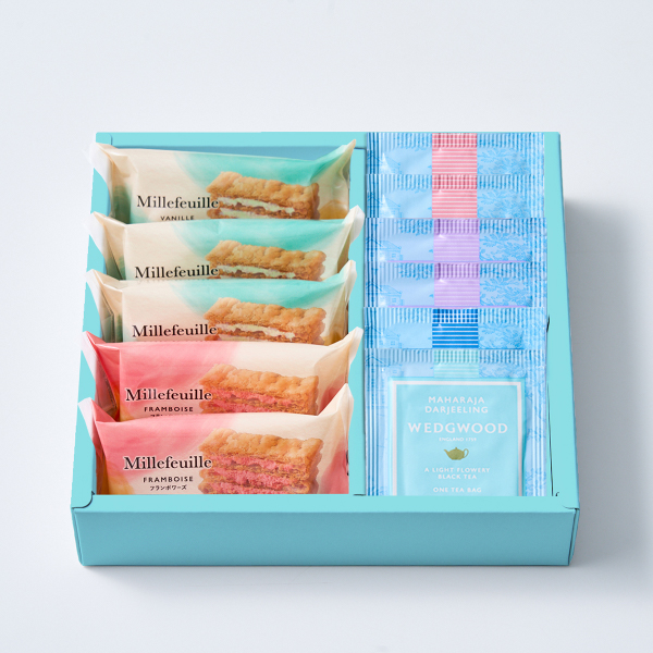 国産小麦100%のパイ生地に、バニラとフランボワーズの2種のクリームをサンドしたミルフィーユと、ウェッジウッドの紅茶4種をセットにしました。サクサクのパイと風味豊かなクリーム、そして紅茶の芳醇な香りが口の中に広がる、贅沢なティータイムをお楽しみください。