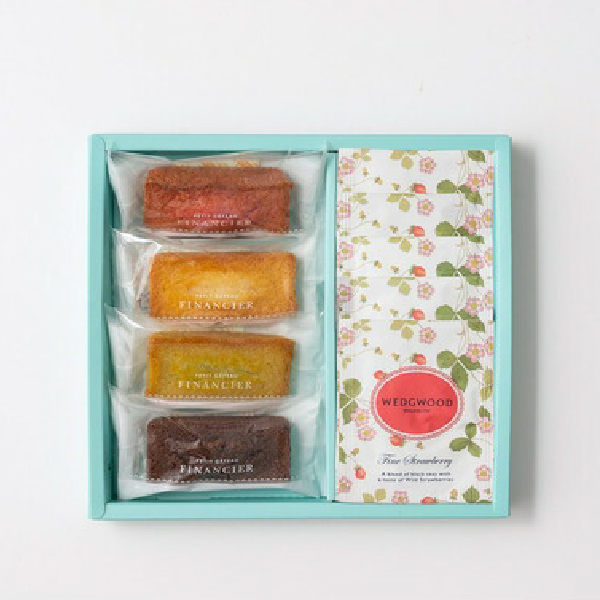 ストロベリー、プレーン、ピスタチオ、チョコの4種類のフィナンシェと、ウェッジウッドの代表柄「ワイルド ストロベリー」の可愛らしいパッケージの4種類のティーバッグをセットしました。