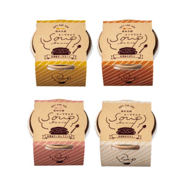 北海道の自然素材を生かした濃厚なCUPスープ。定番の北海道産チーズコーンや、味わい深く濃厚な北海道産かぼちゃ、お子さまにも人気高い北海道産サーモンクリーム、パンやクルトンなどトッピングをしても美味しい北海道産オニオンなど、贅沢に4種類を詰め合わせました。ポップで可愛らしいナチュラルテイストのパッケージに包まれたスープセットは、老若男女問わずお贈りいただけます。