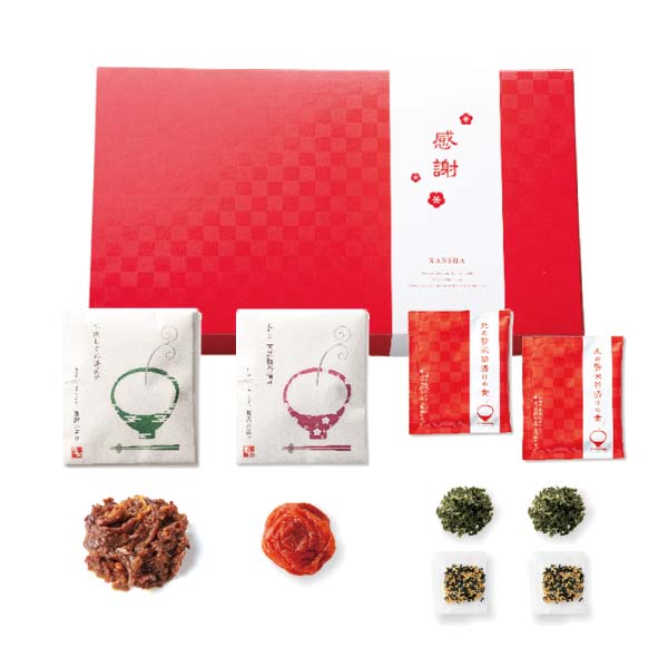 厳選素材で味わうちょっと贅沢なお茶漬け。お店で味わうような本格的なお茶漬けをご家庭で。梅の木が長生きであることから「長寿」の縁起を担いで食されます。梅のように年月を重ねて成熟した夫婦になりますとの想いを込めた、縁起物として人気のギフトです。牛しぐれ(レトルト)、しそ漬け紀州南高梅、贅沢茶漬けの素、お茶漬け用の具(刻み海苔、ゴマ・わかめ)を贅沢に詰め合わせました。