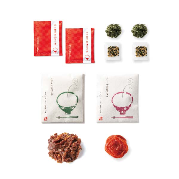 | 内容 | 牛しぐれ(レトルト)×1、しそ漬け紀州南高梅×1、贅沢茶漬けの素5g×2、お茶漬け用の具(刻み海苔、ゴマ・わかめ)×各2 |