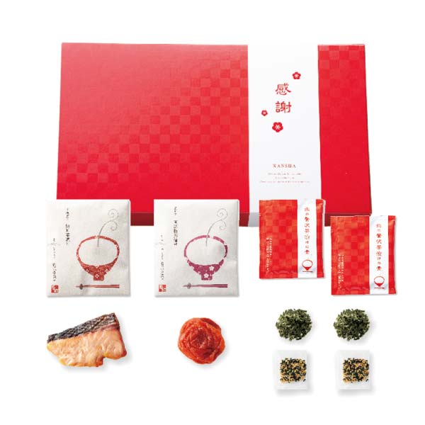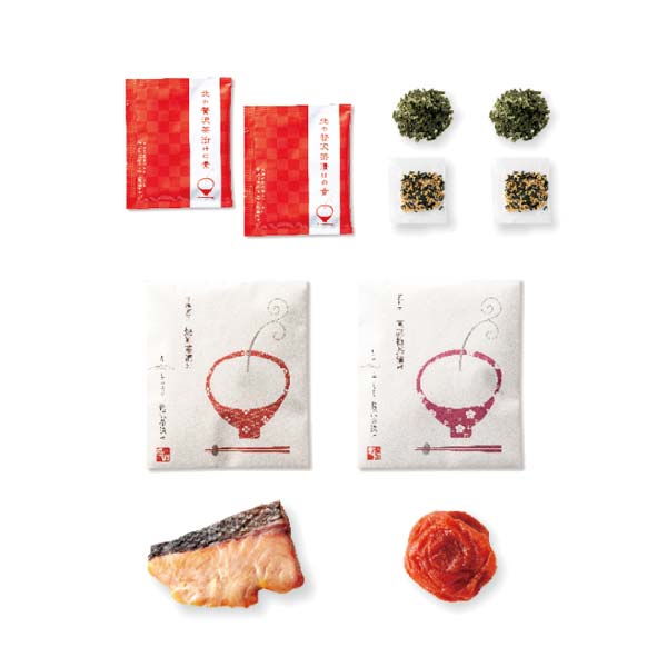 | 内容 | 鮭(レトルト)×1、しそ漬け紀州南高梅×1、贅沢茶漬けの素5g×2、お茶漬け用の具(刻み海苔、ゴマ・わかめ)×各2 |