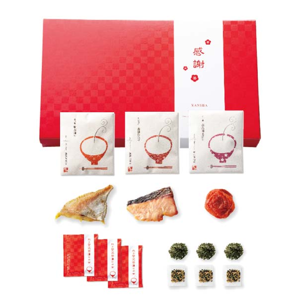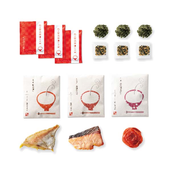 | 内容 | 鯛(レトルト)×1、鮭(レトルト)×1、しそ漬け紀州南高梅×1、贅沢茶漬けの素5g×3、お茶漬け用の具(刻み海苔、ゴマ・わかめ)×各3 |