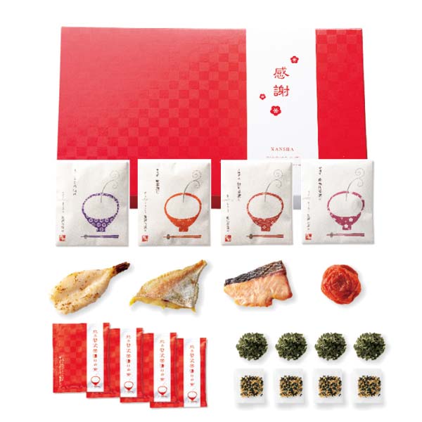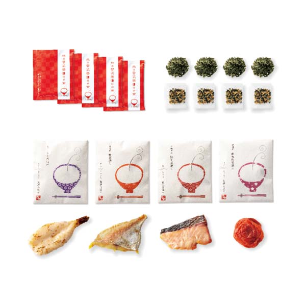 | 内容 | 焼きふぐ(レトルト)×1、鯛(レトルト)×1、鮭(レトルト)×1、しそ漬け紀州南高梅×1、贅沢茶漬けの素5g×4、お茶漬け用の具(刻み海苔、ゴマ・わかめ)×各4 |