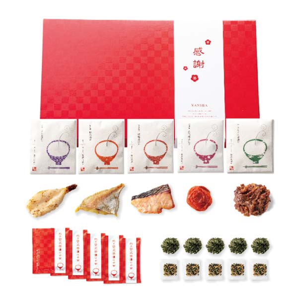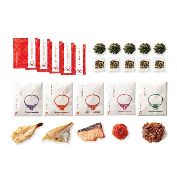 | 内容 | 焼きふぐ(レトルト)×1、鯛(レトルト)×1、鮭(レトルト)×1、しそ漬け紀州南高梅×1、牛しぐれ(レトルト)×1、贅沢茶漬けの素5g×5、お茶漬け用の具(刻み海苔、ゴマ・わかめ)×各5 |