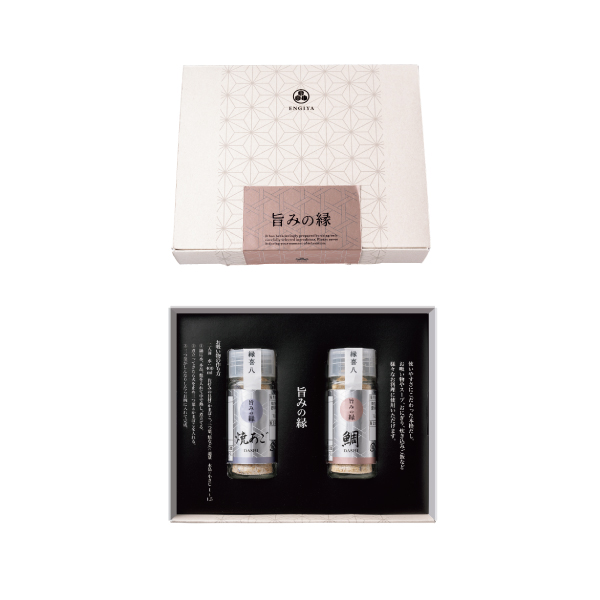 「旨みの縁 鯛・焼あご」は使い方いろいろ。風味豊かな出汁素材と岩塩がミックスされた鯛だし塩と焼あごだし塩のセットです。国内産真鯛エキスを使用し上品でコクのある味わい深い「鯛だし塩」と国内産のあごにまろやかな焼塩を加え香り豊かな「焼あごだし塩」に仕上げております。2種類のだし塩はお料理に重宝する万能調味料です。仕上げのひとふりでだしのきいた一品にもなる旨味たっぷりの万能調味料ですが、「鯛だし塩」はおにぎり・お吸い物・お雑煮、「焼あごだし塩」はおにぎり・うどん・お鍋・煮物など様々なレシピにご利用いただけます。