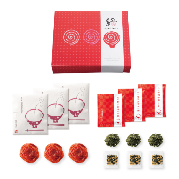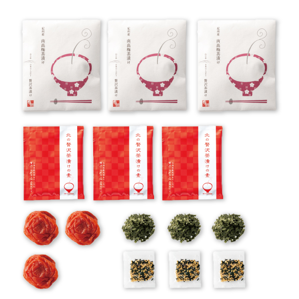 | 内容 | しそ漬け紀州南高梅×3、贅沢茶漬けの素5g×3、お茶漬け用の具(刻み海苔、ゴマ・わかめ)×各3 |
