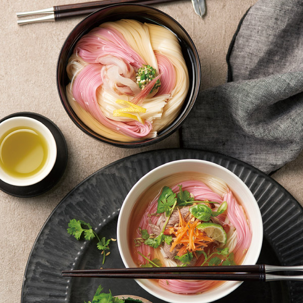 熟練の職人技と自然の恵みからうまれる「揖保乃糸」。盛夏の涼しさを誘う「冷やしそうめん」、厳冬にぬくもりをおぼえる「にゅうめん」。四季折々に食卓を彩る手延べそうめん揖保乃糸のギフト。麺類は「良好な人間関係」や「恋愛運が上がる」などの意味があり、縁起のいい食べ物といわれています。長寿を祈る縁起物として食され、結婚式では「夫婦の絆を長いものに」という願いを込めた一品です。