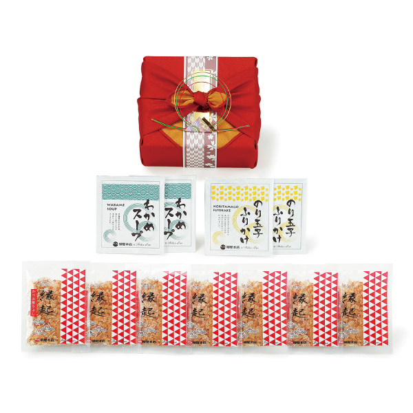 | 内容 | かつお節2g×7袋、のりたまごふりかけ4.5g×2袋、わかめスープ5.3g×2袋、風呂敷1枚(約49.5×49.5cm) |