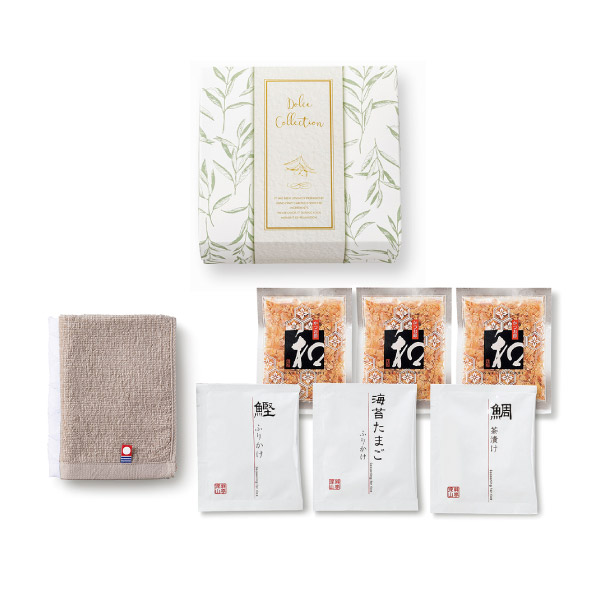 | 内容 | ウォッシュタオル(約34×30cm)×1枚、かつお節3g×3袋、鯛茶漬け6g×1袋、かつおふりかけ3.5g×1袋、のりたまごふりかけ3.5g×1袋 |