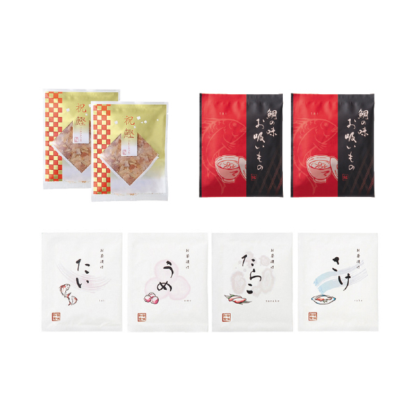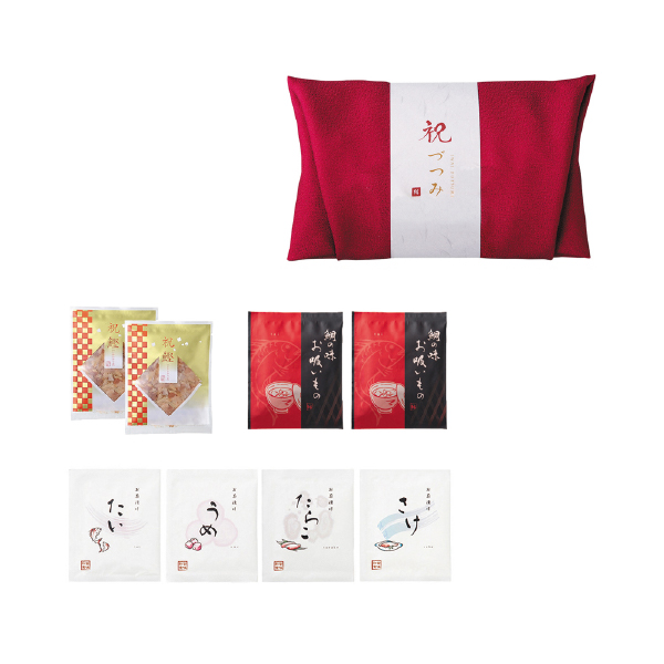 | 内容 | 鰹節3g×2、鯛の味お吸いもの3.8g×2、贅沢たい茶漬け5g×1、贅沢うめ茶漬け5g×1、贅沢さけ茶漬け6g×1、贅沢たらこ茶漬け5g×1、リバーシブル風呂敷(赤、ピンク)580×580mm |