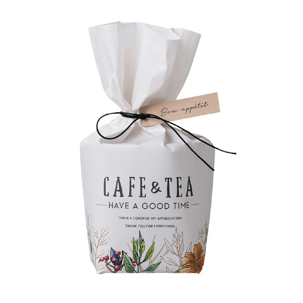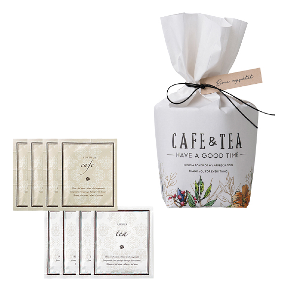 ドリップコーヒーと、三角ティーメッシュが4つずつ入った、ナチュラルシンプルでまるで森の中にいるような、洗練されたパッケージが印象的なコーヒーと紅茶のセットです。仕事や家事で日々いそがしく頑張るゲストに、ゆったりしたカフェタイムを気軽に楽しんでいただけます。単身の方にもご家族とお住まいの方にもおすすめな、おいしいスイーツと一緒に楽しめる縁起物です。