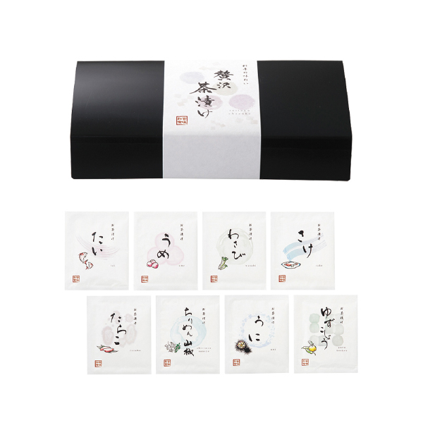 | 内容 | 贅沢たい茶漬け5g×1、贅沢うめ茶漬け5g×1、贅沢わさび茶漬け5g×1、贅沢さけ茶漬け6g×1、贅沢たらこ茶漬け5g×1、贅沢ちりめん山椒茶漬け5g×1、贅沢ふぐ茶漬け5g×1、贅沢ゆずこしょう茶漬け5g×1 |