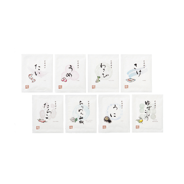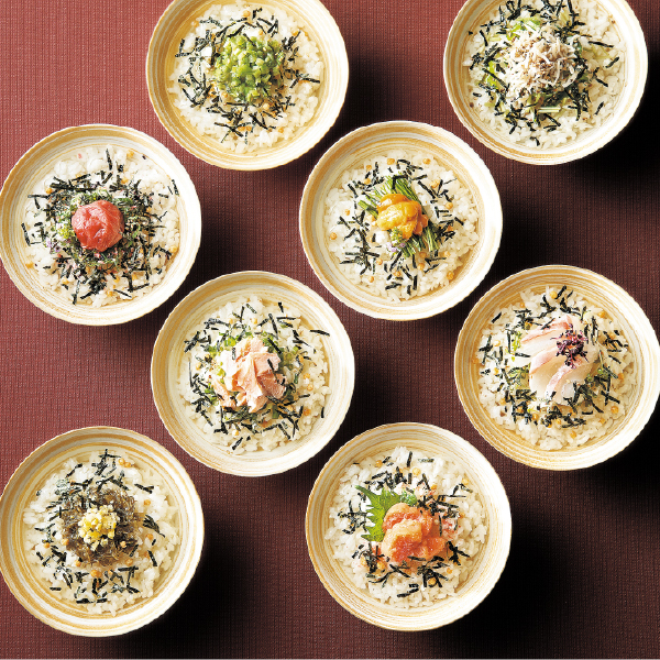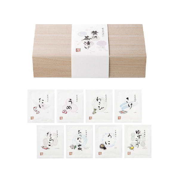 素材にこだわった贅沢な味わい。手の込んだ料理もいいけれど、シンプルに仕上げた料理でじっくり味を堪能しながら良き日に思いをはせる。縁起の良い「鯛」や「うめ」。定番の「わさび」に「鮭」、「たらこ」、「ちりめん山椒」、ちょっぴり贅沢な「ふぐ」、「ゆずこしょう」など8種類のお茶漬けを詰め合わせました。高級感のある上品な木箱は、開ける前から気持ちが高揚すること間違いなし。