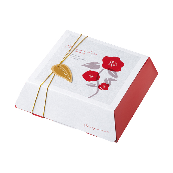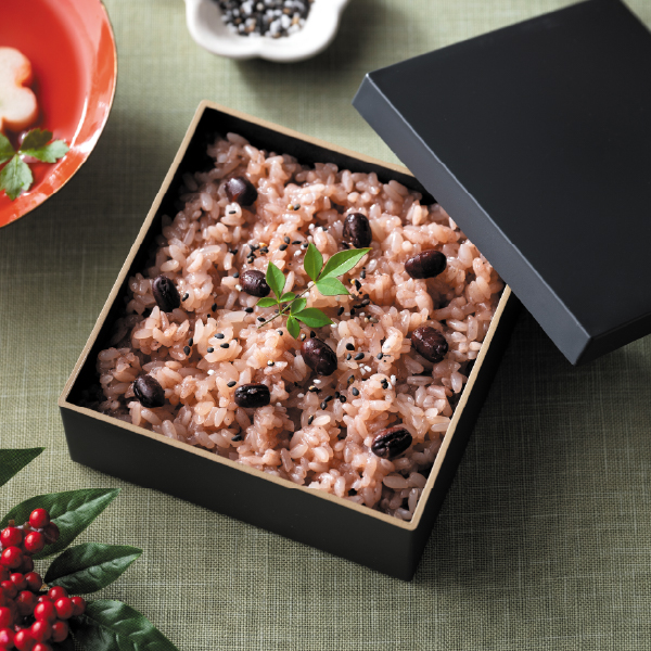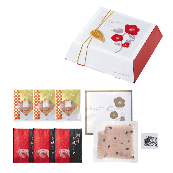 赤色は古来から邪気を払うとされてきたことから、お赤飯がお祝いの席で振る舞われるようになりました。まるで赤色の華やかな椿も2人の結ばれた日をお祝いしているかのよう。縁起の良い赤飯と、鯛の味のお吸い物、かつお節のセットで幸せをおすそ分け。