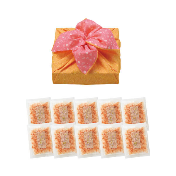 お祝いの気持ちを色とりどりの風呂敷で包んだ華やかな贈り物。味わい深い逸品を、オレンジ色が映えるピンク地に縁起の良い小さくて可愛らしい柄あしらった風呂敷に包んでお届けします。お祝い事に欠かせないかつおソフト削りをたっぷりと10袋詰め合わせました。めでたく結ばれた幸せなお二人から、お二人の門出を祝ってくださった方々へ。目上の方はもちろん、ご年配の方や可愛いもの好きな方への贈り物にも最適です。
