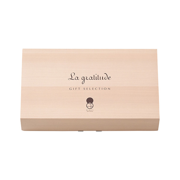 温もりを感じるナチュラル木目のデザイン箱に『La gratitude』フランス語で感謝という意味の言葉を印刷したおいしい贈り物です。