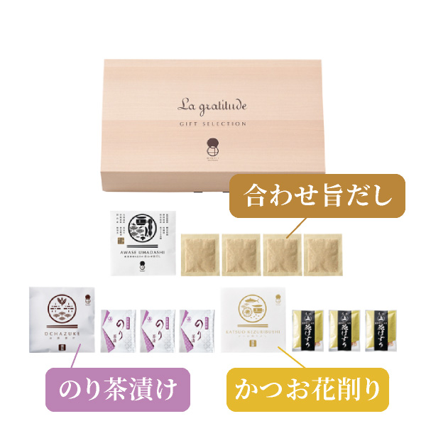 | 内容 | 合わせ旨だし(6g×4入)×1、茶漬け(のり茶漬け5.8g×3入)×1、かつお花削り(2g×3入)×1 |