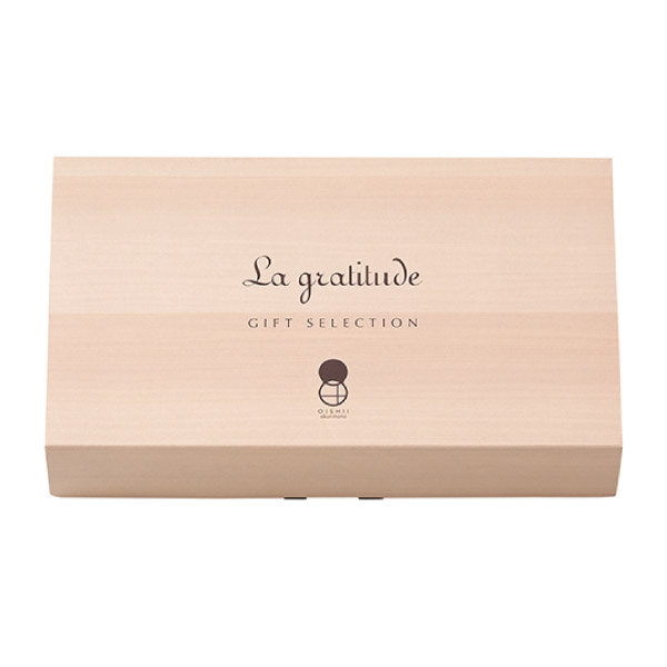 温もりを感じるナチュラル木目のデザイン箱に『La gratitude』フランス語で感謝という意味の言葉を印刷したおいしい贈り物です。