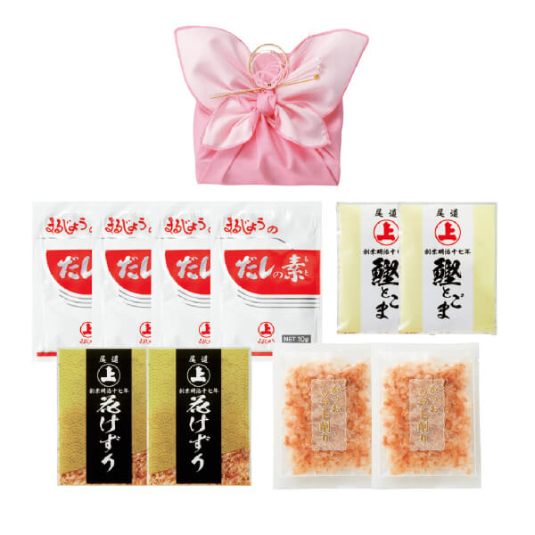 蝶は花と結婚し、決まった花から蜜をもらう代わりに、受粉の手伝いをします。胡蝶(こちょう)は、決まった道(蝶道:ちょうどう)を通り、結ばれた花に通う一途な生き物の「蝶」をアレンジした作品です。包みを開くと中には、お祝いごとには欠かせない、かつお花削り・かつおソフト削りに、だしの素とソフトふりかけ鰹とごまをたっぷり詰め合わせております。お二人のこれからと贈る方への感謝の気持ちを込めて。目上の方はもちろん、若い年代の方への贈り物にも最適です。