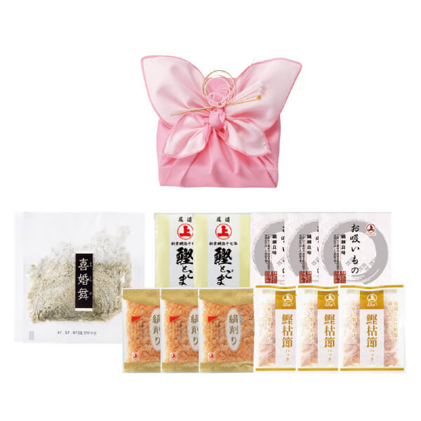 蝶は花と結婚し、決まった花から蜜をもらう代わりに、受粉の手伝いをします。胡蝶(こちょう)は、決まった道(蝶道:ちょうどう)を通り、結ばれた花に通う一途な生き物の「蝶」をアレンジした作品です。包みを開くと中には、お祝いごとには欠かせない、かつお絹削り、とろろ昆布、ソフトふりかけ鰹とごま、、お吸い物、鰹枯節をたっぷり詰め合わせております。お二人のこれからと贈る方への感謝の気持ちを込めて。目上の方はもちろん、若い年代の方への贈り物にも最適です。