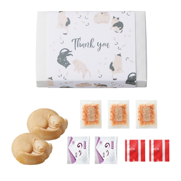 日本では「幸せが訪れる」「縁起がよい」とされているねこ。最中をねこ型にし、皆さまのもとにも福を招いてくれそうな素敵な贈り物です。ねこ型の最中が2個、のり茶漬け2袋、みそ汁2袋、かつお節3袋が入っており、料理の普段使いとしてもお使いいただけます。ねこのデザインが印刷されたラッピングで包み、幅広い年齢層の方にお贈りいただけます。