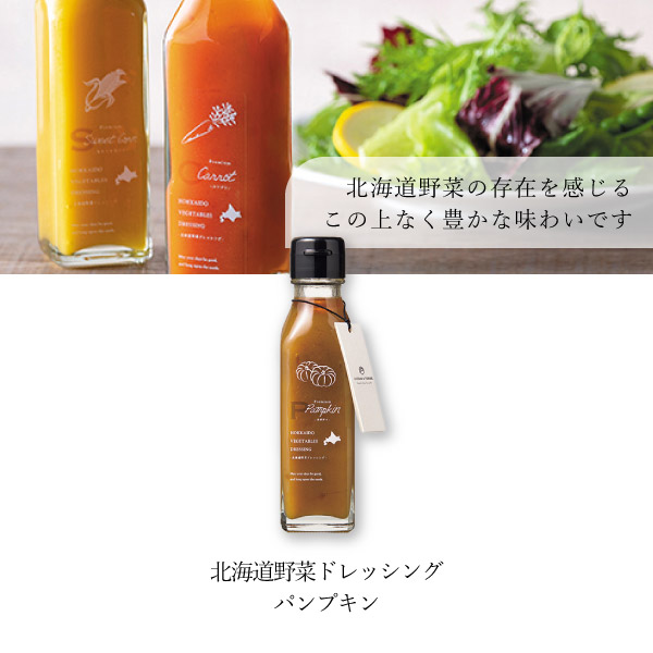 北海道の美味しい野菜で作ったパンプキンドレッシング。かぼちゃのやさしい甘さが、サラダのおいしさを引き立てます。厳選された新鮮な野菜から作られる逸品は、大切な人たちの健康を美味しく気遣います。おしゃれな瓶に、野菜のイラストと北海道のマークが産地を想わせてくれる今人気のギフトです。120mlの使い切りやすいサイズ感も人気のひとつ。