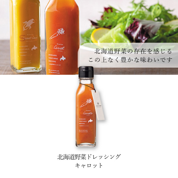 北海道の美味しいニンジンで作ったキャロットドレッシング。ニンジンのやさしい甘さが、サラダのおいしさを引き立てます。厳選された新鮮な野菜から作られる逸品は、大切な人たちの健康を美味しく気遣います。おしゃれな瓶に、野菜のイラストと北海道のマークが産地を想わせてくれるパッケージも魅力。120mlの使い切りやすいサイズ感も嬉しいポイントです。お祝いの席はもちろん、内祝いなど老若男女問わずお贈りいただけます。