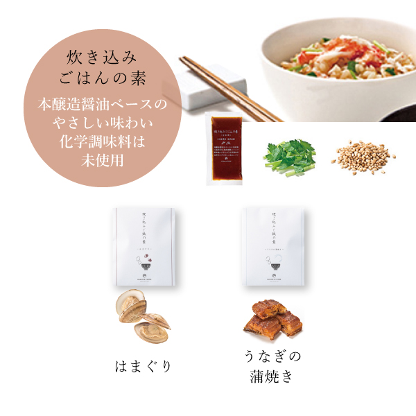 素材の美味しさが詰まった炊き込みご飯の素2食セットです。「はまぐり」と「うなぎの蒲焼き」の炊き込みご飯が簡単調理で楽しめます。三つ葉と白煎りごまが付いており、より一層炊き込みご飯の美味しさが引き立ちます。化学調味料を使用せず本醸造醤油をベースに、国産鶏、日高産昆布、焼津産鰹エキスで、風味豊かに仕上げたやさしい味わいが特徴。2合用なのでご夫婦や家族、一人暮らしの方にもおすすめです。「はまぐり」は古くから縁起のいい食材として婚礼では定番の食材。結婚式の引き出物としてもおすすめ。