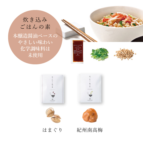 「はまぐり」「紀州南高梅」の2種の炊き込みご飯が楽しめる、美しい風呂敷に包まれた炊き込みご飯の素セットです。はまぐりは古くから縁起のいい食材として婚礼では定番の食材。結婚式の引き出物としてもおすすめです。ゴロっと食べ応えのある具材に、三つ葉と白煎りごまがアクセントになり、おいしさを引き立てます。化学調味料を使用せず本醸造醤油をベースに、国産鶏、日高産昆布、焼津産鰹エキスで、風味豊かに仕上げたやさしい味わいが特徴です。