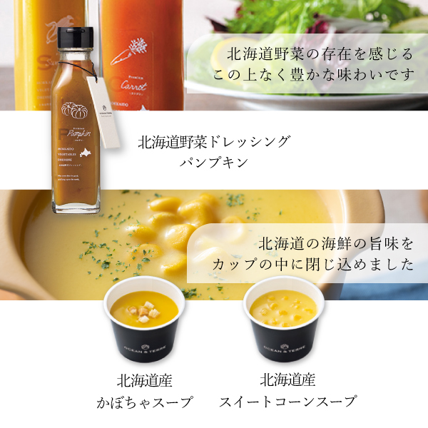| 内容 | 野菜ドレッシングパンプキン120ml×1、北海道産かぼちゃスープ16.5g×1、北海道産スイートコーンスープ16.5g×1 |