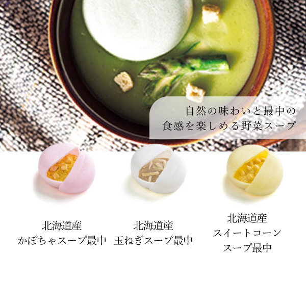 | 内容 | 北海道産かぼちゃスープ最中20.7g×1、北海道産玉ねぎスープ最中11.2g×1、北海道産スイートコーンスープ最中20.7g×1 ※もち米 100%(国産)最中種 |