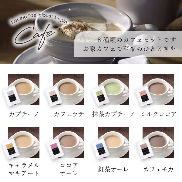 | 内容 | カプチーノ20g×1、カフェラテ20g×1、抹茶カプチーノ20g×1、ミルクココア16g×1、キャラメルマキアート20g×1、ココアオーレ11g×1、紅茶オーレ11g×1、カフェモカ20g×1 |