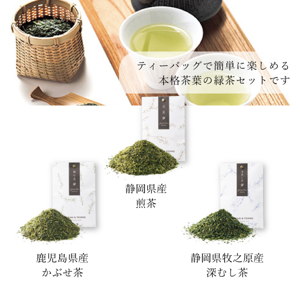 | 内容 | 鹿児島県産 かぶせ茶ティーバッグ2g×10、静岡県牧之原産 深むし茶ティーバッグ2g×10、静岡県産 煎茶ティーバッグ2g×10 |