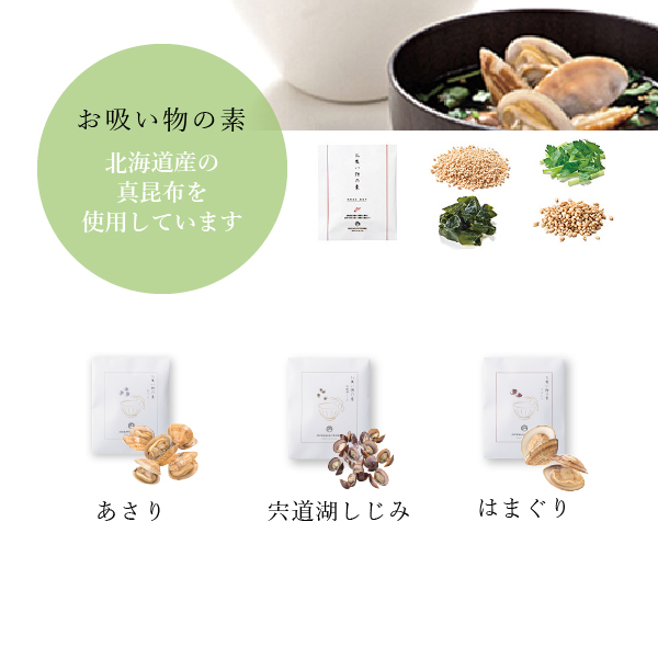 | 内容 | お吸い物の素2.9g×3、はまぐり2個×1、あさり30g×1、宍道湖しじみ30g×1、白煎りごま1g×3 |
