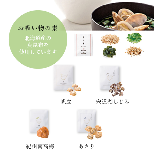 北海道産真昆布を使用し、海鮮で深い旨みを加えた、潮風を感じるお吸い物です。「帆立」「紀州南高梅」「あさり」「宍道湖しじみ」の4種類の詰め合わせ。セットの白煎りごまを振れば、さらに違った味わいをお楽しみいただけます。