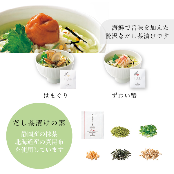 忙しい朝にほっと嬉しい、オーシャンテールのおしゃれで贅沢なだし茶漬け。「はまぐり」「ずわい蟹」 の和の味わい深い2種類のセットです。ご夫婦で絶品のだし茶漬けを味わえるのはもちろん、お一人暮らしの方にも食べ比べを楽しんでいただけるギフトです。北海道産真昆布を使い、静岡県産抹茶の風味を利かせた、海鮮で旨味を加えた贅沢な逸品。シンプルでおしゃれなパッケージは、どなたにも送りやすいデザインです。