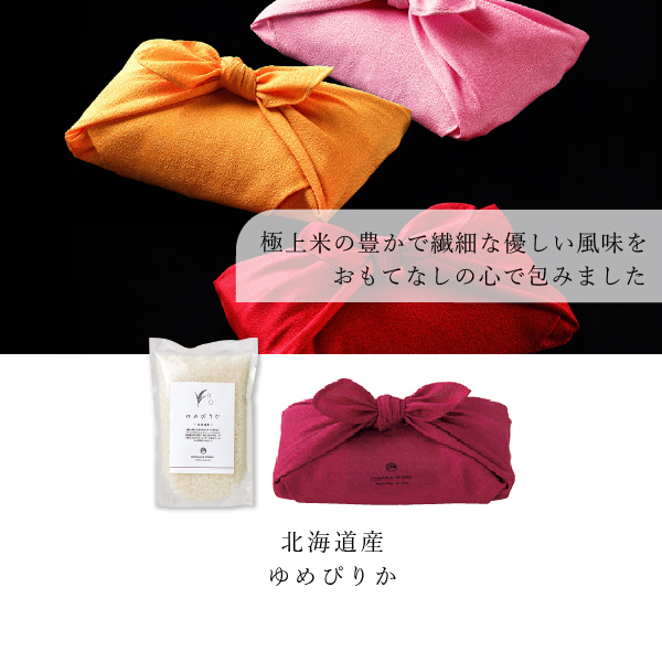 北海道産 ゆめぴりかをおもてなしの心で包みました。北海道最上級ブランド米。粘りが強く、やわらかいと言われており、品種改良を重ねてきた北海道米の技術の集大成ともいえる品種です。甘みが際立ち、濃い味わいの品種。まずは白ごはんで味わうのがおすすめです。日本人の体に深く染み渡る瑞穂の恵みの豊かで繊細な優しい風味をお楽しみください。臙脂色の雅な風呂敷がおめでたく印象良く、縁起物としてぴったりの格調高い贈り物になります。