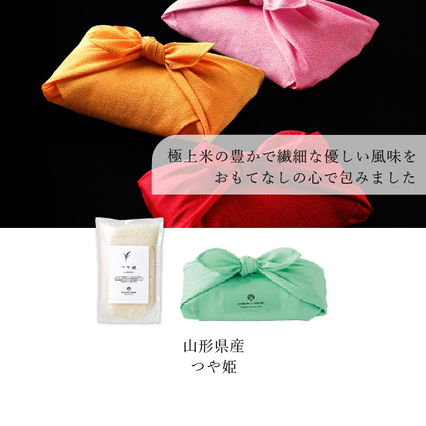 山形県産 つや姫をおもてなしの心で包みました。つや姫の一番の特徴は「美味しさ」です。開発期間に10年を要した山形が生み出した最高のお米。粒ぞろいでその名の通りつやがあり、口当たりよく上品な甘みや、白く輝く炊きあがりをご堪能いただけます。日本人の体に深く染み渡る瑞穂の恵みの豊かで繊細な優しい風味をお楽しみください。美しい風呂敷で包まれた美味しいお米は、縁起物としてぴったりの格調高い贈り物になります。