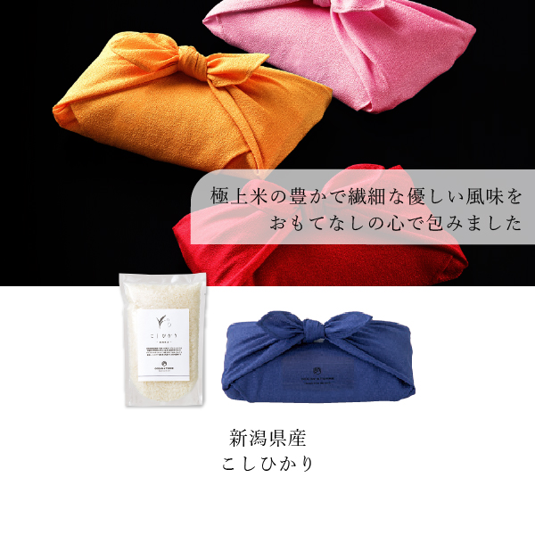 新潟県産 こしひかりをおもてなしの心で包みました。高品質と安全・安心を約束する新潟米の代表格。新潟こしひかりの特徴は、こしひかりが持つ独特の甘みと粘りだけでなく炊き上がったときの香りとツヤにあります。 新潟県は、信濃川や阿賀野川などの河川により稲作に必要な水が十分に確保することができ、稲作に適した土地や天候に恵まれていることから、ほかのこしひかりと比べ粘りと甘みが強いです。日本人の体に深く染み渡る瑞穂の恵みの豊かで繊細な優しい風味をお楽しみください。美しい風呂敷で包まれた美味しいお米は、縁起物としてぴったりの格調高い贈り物になります。