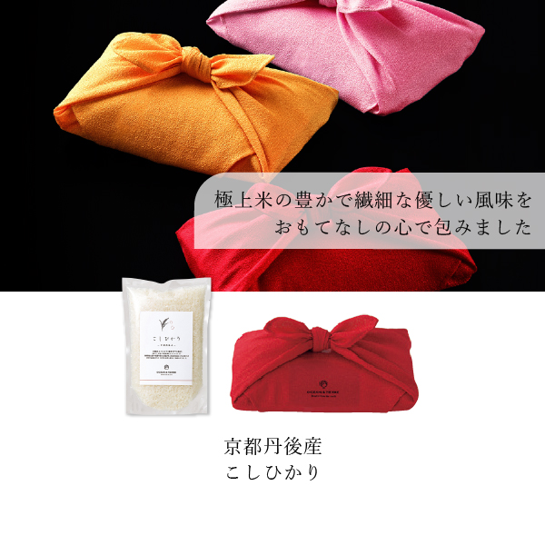 京都丹後産 こしひかりをおもてなしの心で包みました。人気が高い京都丹後産こしひかりの特徴はなんといっても強い旨みともっちり感です。京都米こしひかりは、そのバランスがとても良く、和食から洋食、中華と幅広いおかずと相性の良いブランド米です。日本人の体に深く染み渡る瑞穂の恵みの豊かで繊細な優しい風味をお楽しみください。美しい風呂敷で包まれた美味しいお米は、縁起物としてぴったりの格調高い贈り物になります。