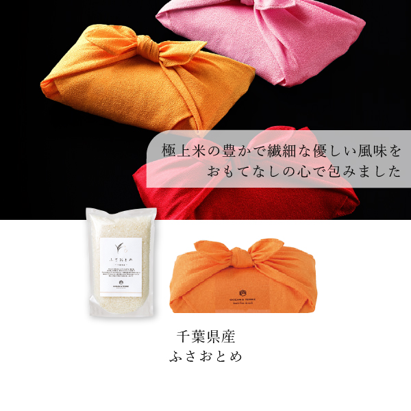 千葉県産 ふさおとめをおもてなしの心で包みました。千葉県が独自に育成したふさおとめ。粒が大きく、炊きあがりつやつやで、見栄えが抜群!粘りは控えめで、あっさりとしたおいしさが特徴です。収穫が早いので関東ではいち早く新米としての味や香りが楽しまれています。日本人の体に深く染み渡る瑞穂の恵みの豊かで繊細な優しい風味をお楽しみください。美しい風呂敷で包まれた美味しいお米は、縁起物としてぴったりの格調高い贈り物になります。