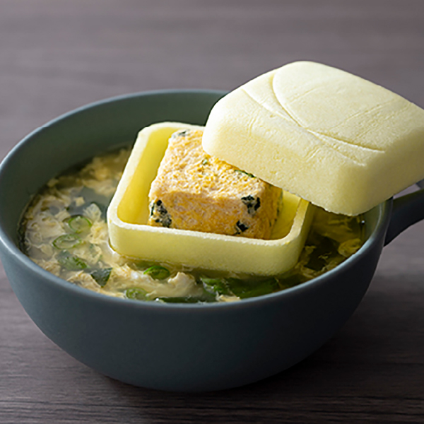 「たまごとわかめスープ」「濃厚たまねぎスープ」「きのこと生姜スープ」を最中にそれぞれ詰め込みました。具沢山のフリーズドライスープを最中と共にお召し上がりいただけます。最中の変わりゆく食感をお楽しみください。