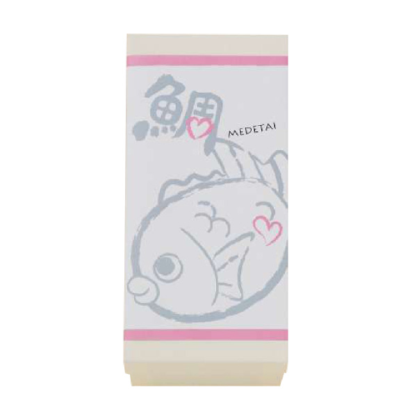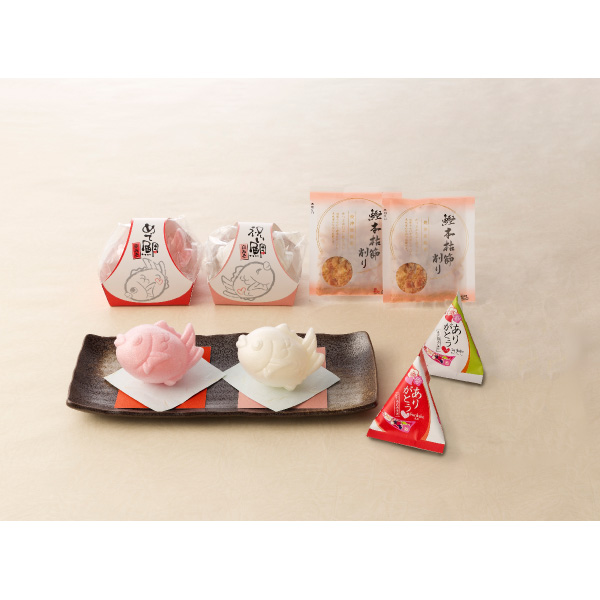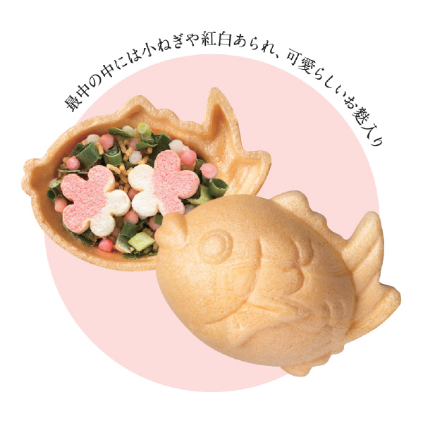| 内容 | めで鯛最中(赤みそ)×1個、祝い鯛最中(白みそ)×1個、ありがとうハートのふりかけ(紀州南高梅×1袋、博多産明太子×1袋)、焼津産かつお本枯節削り×2袋 |