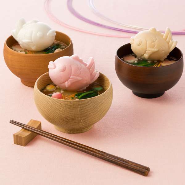 おめで「たい」笑顔を食卓に添えるお味噌汁。「めでたい」に通じる名前を持つことから、縁起のいい魚として愛されてきた鯛。めで鯛最中(赤みそ)、祝い鯛最中(白みそ)、ありが鯛最中(合わせみそ)の3種類を楽しめるセットとなっており、その姿を愛嬌たっぷりにかたどった最中が、お椀に注いだお湯にぷかぷか浮かび、食卓に笑顔を届けます。鯛の文字とイラストをポップにあしらったパッケージに可愛いと感謝の気持ちを込めて。