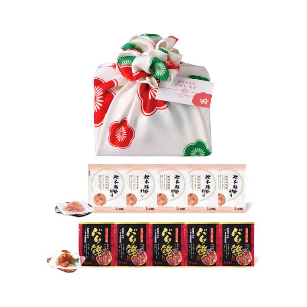 「SHARE MY HAPPINESS.」お二人とゲストのご縁をつなぎ、想いを未来へとつむぐ、感謝を贈ります。お祝い事には欠かせないかつお節には、鰹の背と腹とがあり、それぞれ雄節・雌節と呼ばれ一対で夫婦になることから、二人でいつまでも幸せでいられるようにと、縁起物としてお祝い事に喜ばれています。そんな焼津産かつお本枯節削りと、しょうが醤油味のバリ鰹を包みました。白と赤、緑で彩られた和と花柄をあしらった風呂敷きは縁起の良さを表しています。