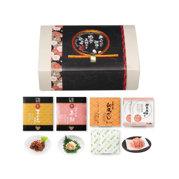 | 内容 | まぐろ茶漬けセット(まぐろ佃煮×1袋、調味パック×1袋)、真鯛茶漬けセット(瀬戸内海産真鯛×1袋、調味パック×1袋)、お茶漬け旨味和風だし×2袋、焼津産かつお本枯節削り×2袋 |